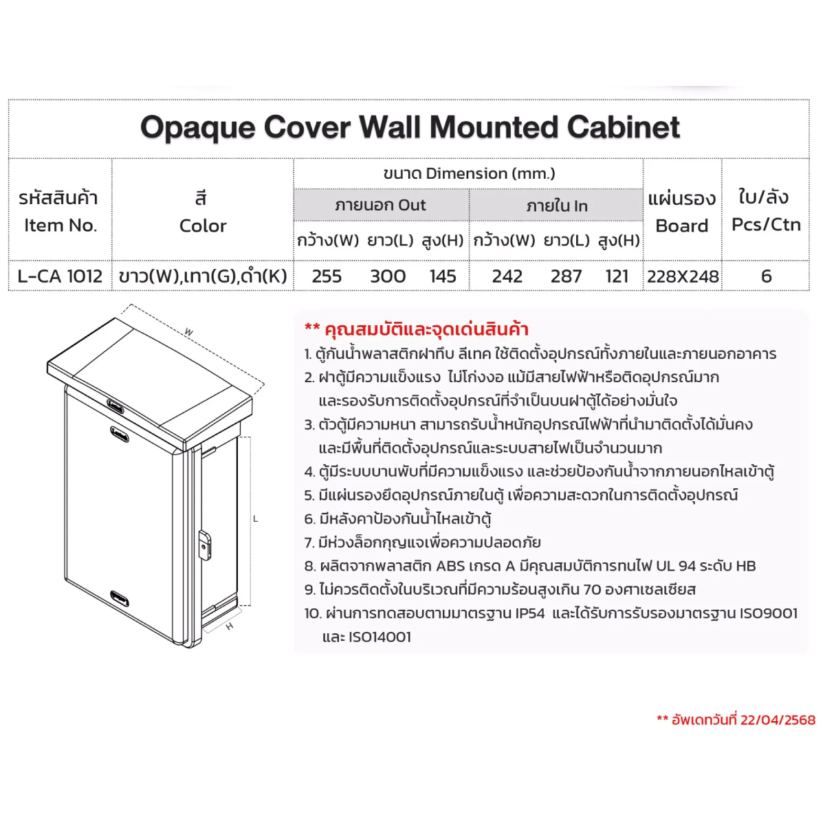 Leetech ตู้กันน้ำพลาสติก ขนาด 10x12 ฝาทึบ และ ฝาใส มีหลังคา ( L-CA1012 / L-CT1012 )