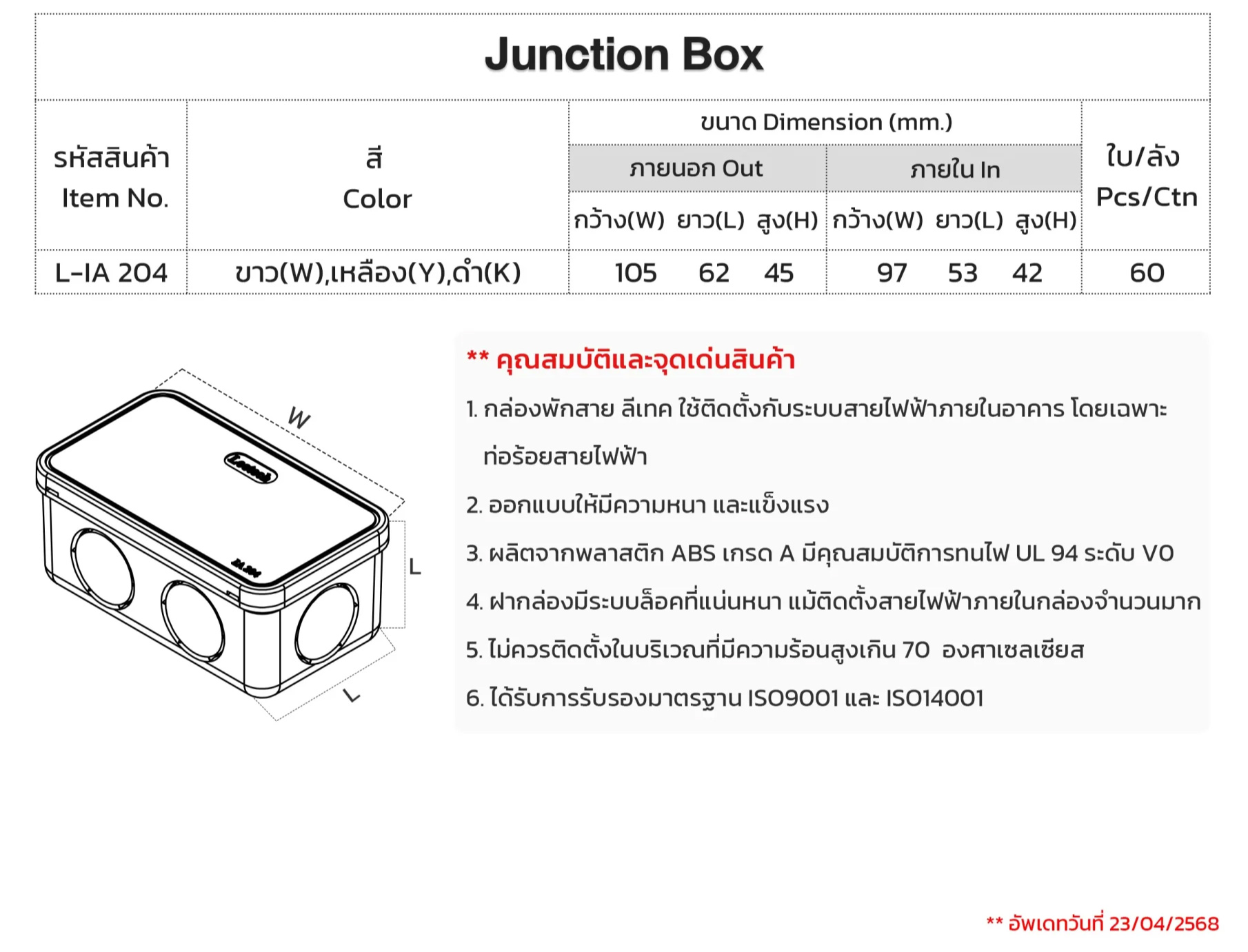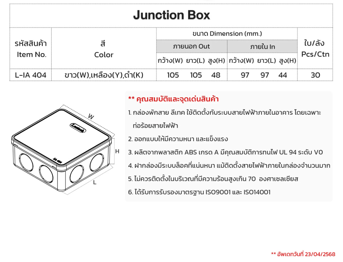 กล่องพักสาย (Junction Box) Leetech ใช้รวมหรือแยกสายไฟฟ้า สายสัญญาณ เพื่อความสะดวกในการติดตั้งภายในอาคาร เหมาะสมกับการติดตั้งด้วยระบบท่อร้อยสายไฟฟ้า กล่องฯ ออกแบบให้มีความแข็งแรง มีระบบฝาล็อคที่แน่นหนา แม้ติดตั้งสายไฟฟ้าภายในกล่องจำนวนมาก กล่องฯสีเหลืองและสีขาวผลิตจากพลาสติก ABS เกรด A
